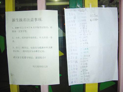 記者趕到現(xiàn)場時(shí),看到幼兒園門前排起了上百人的隊(duì)伍,大部分人都帶著小板凳,有的甚至帶來了帳篷支在學(xué)校門口,看樣子要打持久戰(zhàn)。記者奇怪,現(xiàn)在才2月份,小孩要到9月份才能入園,有必要現(xiàn)在就排隊(duì)嗎?還冒雨。正在排隊(duì)的蘇先生告訴記者,明月港灣雙語電腦幼兒園貼出了告示,通知小區(qū)居民于2月9日早上8點(diǎn)到幼兒園登記報(bào)名,先到先得(號)。當(dāng)天中午,他咨詢了幼兒園,一位老師告訴他,去年幼兒園招小朋友,也是家長排隊(duì)的。如果排在后面,超過了幼兒園收生的限制,那就上不了了。蘇先生的兒子到9月份滿三周歲,就要上幼兒園了。同時(shí)蘇先生了解到,幼兒園小班是25人,但登記的人數(shù)已經(jīng)達(dá)到近50人了。蘇先生緊張起來,立刻加入到隊(duì)伍中,再朝前面一看,他排在第24位。接著就陸陸續(xù)續(xù)的有家長來排隊(duì),到晚上8點(diǎn)多,隊(duì)伍已經(jīng)有上百人了。