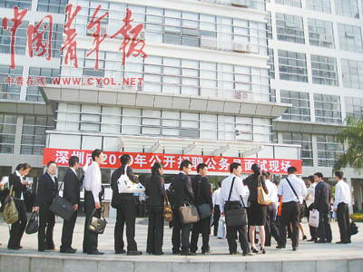 23歲的鐘文去年從深圳大學(xué)法學(xué)專業(yè)畢業(yè),她報(bào)考的是深圳市坪山新區(qū)執(zhí)法員的職位。和鐘文一樣來參加面試的考生有1036人,是從34545名考生中通過筆試篩選出來的“幸運(yùn)兒”。今天,他們將經(jīng)歷又一次殘酷競爭——只有346人能最終進(jìn)入深圳的聘任制公務(wù)員隊(duì)伍。