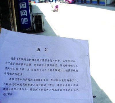 5月30日,有網(wǎng)友發(fā)帖稱,山西臨縣因?yàn)榧磳⒏呖,?qiáng)制關(guān)閉了該縣城所有網(wǎng)吧,帖子中說“全縣所有的網(wǎng)吧都在劫難逃,光纜被停,只能用電話線上網(wǎng)”。發(fā)帖網(wǎng)友責(zé)問“你們關(guān)閉網(wǎng)吧依據(jù)的是哪條法律?”