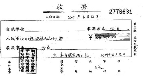 6月15日,學校籌集了45萬元現(xiàn)金,匯給了楊某的指定賬戶。令人意外的是,這個賬戶并不是學校的公共賬戶,而是一個名叫“王貞”的私人賬戶。等他們拿到收據(jù)后,上面蓋的公章是“湖北省經濟管理干部學院博智教學站”。