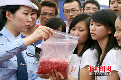 為使大學生識毒、防毒、拒毒、禁毒,當日,重慶沙坪壩警方將5月份繳獲的一批毒品及制毒、吸毒工具帶進了大學城,禁毒民警在現(xiàn)場為師生們講解了毒品危害。同時,警方還向大學師生發(fā)放了禁毒知識手冊。