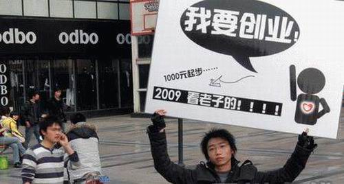 “我要創(chuàng)業(yè),1000元起步……2009,看老子的!”昨(8)日下午4時許,香檳廣場上,一名小伙子擺出一副“牛”架勢,舉著自制的告示牌,喊著“自主創(chuàng)業(yè)”的口號,引來了附近路人紛紛駐足觀看。