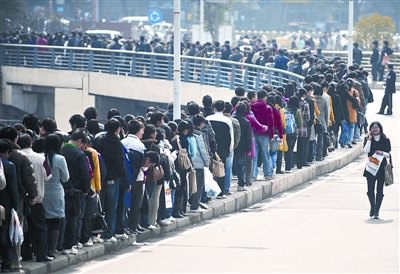 20 日,“湖北省2009年新春大型人才招聘會”在華中科技大學光谷體育館舉辦。這場招聘會是2009年春節(jié)后首場針對大學生的招聘會,近4萬名求職者擁向會場,隊伍最長時有3公里。上圖:當天下午1時20分,一些學生投完簡歷走出體育館,而門外還聚集著大量等待進場的學生。
