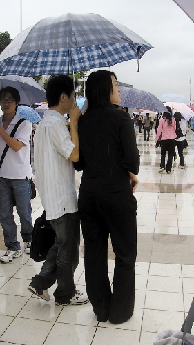 “好煩,早知道下雨就不來了,討厭!”為給面試官好印象,女大學(xué)生丹丹特地選了一套淺色條紋的套裝。但恰逢招聘會當(dāng)天是下雨天,丹丹的小套裝一下就粘上了點點雨花。丹丹一邊整理,一邊對身旁負(fù)責(zé)撐傘的男友撒嬌,而男友則不厭其煩地細(xì)語安慰:“忍一下就好,快到你了……”