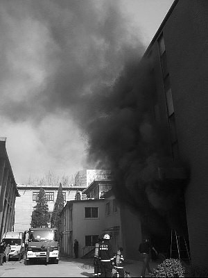 經(jīng)消防員撲救,大約20分鐘后,濃煙漸漸變小,消防員和幾名同學(xué)進(jìn)入實(shí)驗(yàn)室,將未燒毀的實(shí)驗(yàn)儀器、資料和一些辦公用品轉(zhuǎn)移出來(lái)。