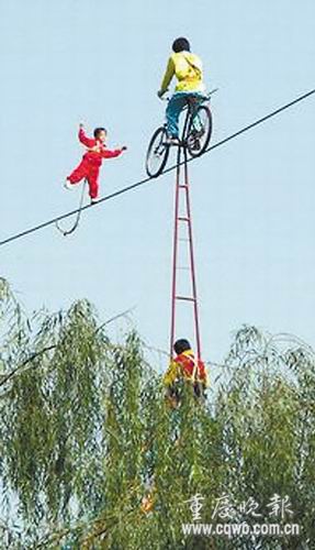 據(jù)了解,學走鋼絲的第一步是從單腳站磚頭開始,逐漸增加高度和難度。經(jīng)過這種循序漸進的訓練,張婭很快掌握了低空走鋼絲技巧。經(jīng)指導,她又學會在鋼絲上表演“金雞獨立”、“旋轉(zhuǎn)”、“平臥”等高難度動作。通常,走鋼絲表演者手里要拿東西保持平衡,可張婭學藝一年左右,就能做到空手走鋼絲,還能突然躺在鋼絲上“睡覺”和“起床”!