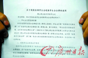 記者調查了解到,佛山職業(yè)技術學院是佛山的一所大專院校,共有十幾個專業(yè),三年制,全校共有3000多名學生。從2007年年底,該學院的學生會要求全校學生交納學生會會費,開始時是每年交一次,一次交20 元,后來改成一次性交齊60元。三個年級三年下來收費將達18萬元。