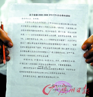 記者從該學校學生會2008年12月15日下發(fā)的一份蓋有公章的《關于收取2008~2009學年學生會會費的通知》上看到,收取會費的根據是佛山職業(yè)技術學院第三次學生代表大會通過的《佛山職業(yè)技術學院學生會章程》(修改)中的有關內容,“凡取得佛山職業(yè)技術學院學籍的在校學生,均為本會會員”、“學生會經費來源,會員在校期間交納學生會會費(每人每年20 元),由系學生會收繳,留用70%,上繳學院學生會30%。”