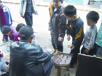 昨日12時(shí)20分,正是學(xué)校放學(xué)的時(shí)候,記者現(xiàn)場(chǎng)看到,門(mén)口一家文具店里赫然擺著抽獎(jiǎng)機(jī)。許多孩子圍在一起,他們買(mǎi)來(lái)卡片按卡面印刷的獎(jiǎng)品現(xiàn)開(kāi)現(xiàn)兌。校門(mén)口左邊,還有一個(gè)老人擺著彈珠子的小賭博機(jī);右邊,一個(gè)婦女?dāng)[抽獎(jiǎng)攤,同樣吸引了不少學(xué)生(見(jiàn)圖)。