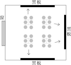 他們的教室不一般。課桌不再是傳統(tǒng)的“秧田式”,而是排成“工”字形擺放。一個(gè)“工”由6張課桌組成,一個(gè)教室大約有8組!斑@樣就構(gòu)成了擁擠卻不乏溫馨的小組型學(xué)習(xí)園地,很多課堂教學(xué)任務(wù)需要一個(gè)小組去完成,在這個(gè)過程中可以培養(yǎng)學(xué)生的合作能力、自主學(xué)習(xí)能力!眲浿钢附淌宜闹,原來白墻的地方都安置了黑板,也就是說,一個(gè)教室至少有三面黑板!八械暮诎逵媚z帶紙分隔成40厘米左右寬度的小塊,供小組內(nèi)學(xué)生板演、展示之用。數(shù)學(xué)習(xí)題、英文單詞、語文生字、古詩……內(nèi)容隨課程的交替而常換常新!