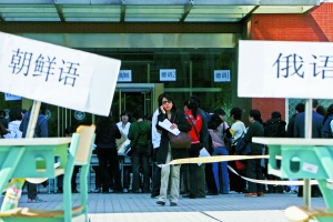 二外今年8個(gè)小語(yǔ)種專業(yè)計(jì)劃招收102人,昨日?qǐng)?bào)名現(xiàn)場(chǎng)吸引來(lái)2300余名家長(zhǎng)和學(xué)生,F(xiàn)場(chǎng),一位家長(zhǎng)拿著計(jì)算器核算一番后,決定替孩子報(bào)考朝鮮語(yǔ),“這個(gè)專業(yè)報(bào)考的人少,分?jǐn)?shù)自然不會(huì)太高!