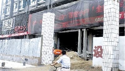 走進大樓內(nèi),施工聲不絕于耳,通道兩側(cè)堆滿建筑材料,墻體上的鋼架結(jié)構(gòu)沒有拆除。