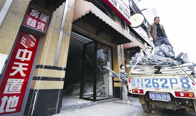 記者發(fā)現(xiàn),這家中介公司已人去樓空。盡管中介公司的牌子依然高掛,但屋內(nèi)卻破敗不堪,工人正在清理殘余物資。