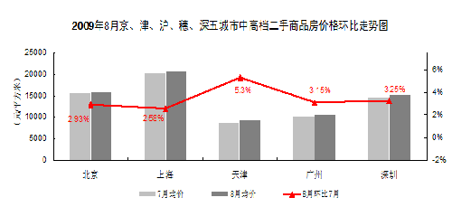 從圖表中的數(shù)據(jù)可以看出,2009年8月京、津、滬、穗、深五大城市的中高檔二手房價格均呈上漲走勢。在上述五大城市中,8月份中高檔二手房上海和北京分別上漲2.58%和2.93%?傮w來看,2009年8月五大城市中高檔二手商品房在市場成交活躍的促進作用下,價格再創(chuàng)新高。價格上漲最明顯的依然是天津,上漲了5.3%。其次是深圳和廣州,分別上漲3.25%和3.15%。