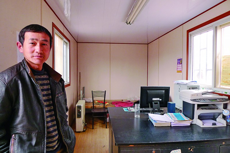 “你看到的只是外面,里面更好!痹摴さ匾晃恍振T的負(fù)責(zé)人自豪地說。果然如馮先生所言,房間內(nèi)部別有洞天。四周墻壁不但加裝了保溫層,還進(jìn)行了裝飾。上有吊頂?shù)鯚,下鋪?fù)合木地板,窗戶上包了窗套,墻上安了插座和電箱,空氣開關(guān)的電閘有模有樣,桌上還放著電腦和打印機(jī)等辦公設(shè)備!霸趺礃?還不錯吧?在工地上住這樣的房子算是一種奢侈了。這些電源插座都不是擺設(shè),用暖氣和空調(diào)都沒問題!瘪T先生介紹說。