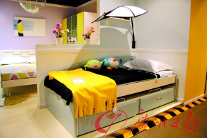 記者看到很多類似組合:高架床,床旁邊是一個小扶梯,扶梯臺階由幾個抽屜拼成,抽屜可以儲放衣物。床下面是一個轉(zhuǎn)角電腦學(xué)習(xí)桌,可以放置一臺電腦,又可以當(dāng)書桌使用。在電腦桌旁還放有一個小衣柜,可以放置一些常用衣物。另一轉(zhuǎn)角處有一個文件柜,可以放學(xué)習(xí)資料和書籍。電腦桌被分隔成二層,底下的一層還可以放小物件、書籍等。大約兩平方米的空間就這樣被充分利用起來了。