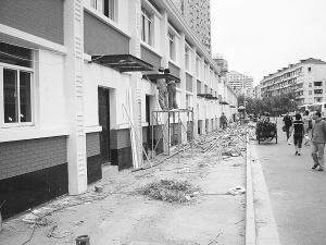 這排房屋從南車站路陸家浜路口延伸到南車站路麗園路口,全部建在人行道上,共有十幾個門面,曼延數(shù)百米。房屋高二層,目前還在施工,大量建筑材料散亂堆放(見圖 屠仕超 攝)。行人只能走上非機動車道、機動車道,與車流相伴。