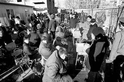 晚9時(shí)后,居民們有的鉆進(jìn)帳篷里,有的則用棉大衣把自己緊緊地包裹起來(lái),不時(shí)喝一口暖壺中的熱水,或是來(lái)一口小酒。人群中不時(shí)傳來(lái)幾句議論,話題都是“你家能分到多大的房子”。
