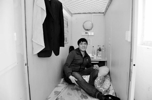 黃日新的膠囊公寓位于六郎莊一幢三層灰色民居的頂層。來到“膠囊公寓”門口,眼前一間10平方米左右的小屋里并排立著2個類似儲藏室、通體白色的隔間。每個隔間大約占地2平方米,高約2米、長2.4米、寬0.72米!斑@床就連姚明也可以睡,他可以從門這邊開始睡,就把腳伸到電腦桌里面去了。”黃日新說。記者看到,隔間外安著雙鎖防盜門,門內(nèi)無縫隙地鋪著張窄長的木板床,床下很空,可以放行李和雜物。床的盡頭有張電腦桌,墻上有盞圓形壁燈,壁燈下面有寬帶接口、有線電視接口和兩組電源插座。“膠囊”的上方由鐵網(wǎng)焊接而成,這不僅使得屋頂?shù)臒艄饪梢酝高^網(wǎng)子保證隔間內(nèi)的采光,還可以充分利用房子的暖氣、空調(diào)。拍拍“膠囊”的墻板,有些薄,隔音效果也不太好。黃日新解釋說,許多隔音材料的防火性能不好,可防火才是第一位的,于是,他舍棄了隔音。而考慮通風(fēng),所以也沒有封頂!暗珵榱吮Wo(hù)個人隱私,我在頂部安了兩根鋼筋桿,可以掛衣服,也可以掛‘頂簾’,拉上后就是個封閉空間!