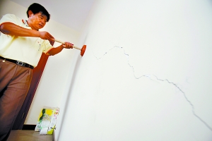 業(yè)主楊女士稱,2005年7月份交房,當(dāng)年9月承重墻出現(xiàn)裂縫,此后裂縫越來越多,她向開發(fā)商反映后,開發(fā)商派人將裂縫鑿開深3厘米,寬約15厘米的槽,然后用水泥砂漿抹平。