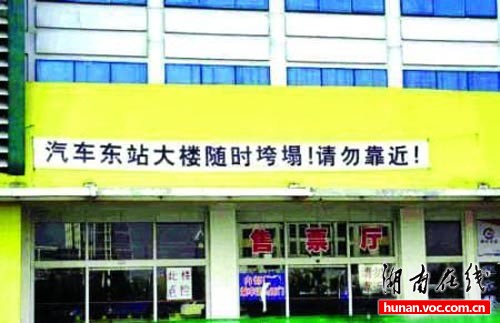 該工作人員表示,車站邀請專家對大樓進行鑒定指出,此樓隨時會垮塌,有可能發(fā)生脆性斷裂,人員在里面非常危險,所有的辦公單位已經(jīng)搬出!按虺鰴M幅是為了提醒廣大市民‘此樓危險’。”