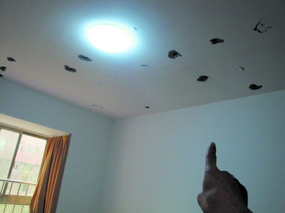 12月7日中午,在物業(yè)公司服務(wù)的王小姐走進租住的岳麓區(qū)西岸潤澤府小區(qū)6棟307房,立即發(fā)出一聲尖叫,她發(fā)現(xiàn)自己本來干凈整潔的床鋪上散落著大大小小的水泥塊,而本來光潔白亮的天花板出現(xiàn)了幾十個洞!爱(dāng)時第一感覺以為是發(fā)生了地震。細數(shù)發(fā)現(xiàn),竟有29個洞!焙献獾囊荒泻⒆痈嬖V記者。后來大家明白了,這是樓上裝修引起的問題。