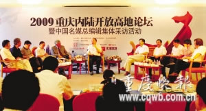 昨日,“2009內(nèi)陸開發(fā)高地論壇”在我市舉行,國內(nèi)十家知名媒體的總編輯應(yīng)邀到會,他們包括了南方周末總編輯向熹、第一財經(jīng)日報總編輯秦朔、21世紀經(jīng)濟報道總編輯劉洲偉、中國新聞社社長劉北憲、新浪網(wǎng)總編陳彤、中國周刊執(zhí)行社長朱德付、新京報總編輯戴自更、新聞出版報社長姜軍等。老總們集體采訪了市委常委、常務(wù)副市長黃奇帆,請他闡釋“重慶怎樣才算建成內(nèi)陸開放高地”,黃奇帆回答說:“我個人認為,將來重慶成了長江上游的經(jīng)濟中心、金融中心和貿(mào)易中心,內(nèi)陸開放高地就算建成了!