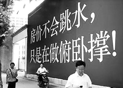 這種房產(chǎn)廣告,不禁讓人聯(lián)想起之前在南京中央大道推出的另一個(gè)巨幅樓盤廣告:“房?jī)r(jià)不會(huì)跳水,只是在做俯臥撐!倍咚悸啡绯鲆晦H,都是利用網(wǎng)絡(luò)熱門流行語來博出位、吸引眼球,從而達(dá)到促銷的目的。