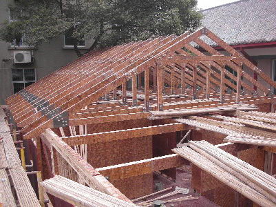 據(jù)介紹,竹結(jié)構(gòu)住宅所用的結(jié)構(gòu)構(gòu)件和連接件都是采用工廠標(biāo)準(zhǔn)化生產(chǎn),蓋房子就像搭積木一樣。施工過程類似于北美的平臺(tái)式輕型木結(jié)構(gòu)住宅施工,其樓蓋和墻體分開建造,因此已建成的底層樓蓋可以作為上部墻體施工時(shí)的工作平臺(tái)。通常墻體骨架可在工作平臺(tái)上拼裝,然后人工抬起就位。墻體也可在其他地方先拼裝好,再運(yùn)到施工現(xiàn)場(chǎng)就位。