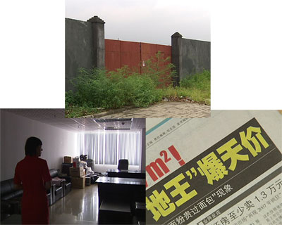 2007年9月11日,保利地產(chǎn)在一天之內(nèi)以8769和8112的高昂價格,拿下了這里的兩塊土地,成為地王。現(xiàn)在土地已經(jīng)被鐵皮墻包圍起來。大門門口雜草叢生,看起來很少有人光顧。我們找到了看守工地的施工人員。