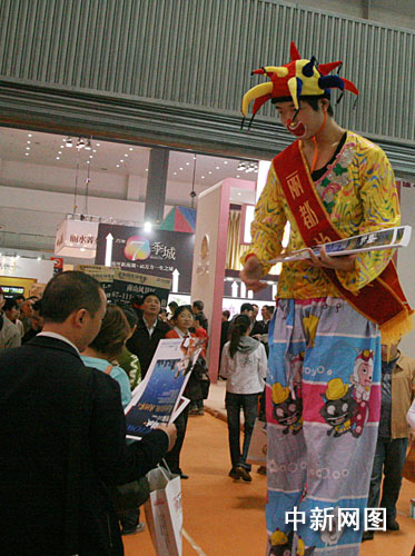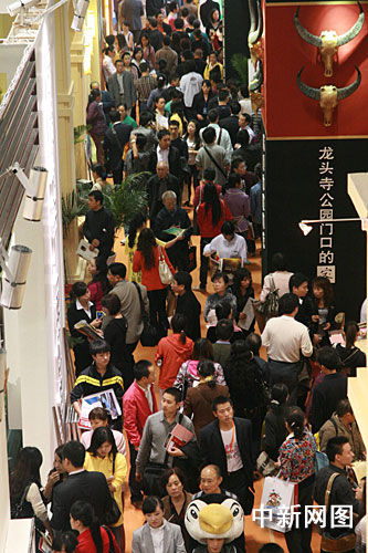 在房交會現(xiàn)場,房地產(chǎn)開發(fā)商們?yōu)槲搜矍颍贡M渾身解數(shù)攬客。禮儀小姐舉著牌子,打著樓盤的廣告語,滿場游行;馬戲團(tuán)小丑、美女模特站在展臺門口派發(fā)傳單;衣著印有樓盤信息T恤衫的促銷人員,四處游說和宣傳,為自己的展臺吸引人氣……