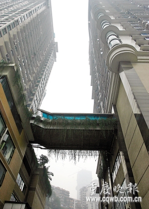 嘉園有業(yè)主500余戶,錦園有業(yè)主600余戶。當(dāng)初,開發(fā)商特意在兩樓之間設(shè)計了一座天橋,目的是讓兩個小區(qū)的空中花園、健身器材等可以共享,更重要的是方便兩個小區(qū)業(yè)主出入——錦園的業(yè)主可以經(jīng)嘉園直達(dá)臨江門、解放碑,嘉園業(yè)主也可經(jīng)錦園到一號橋。