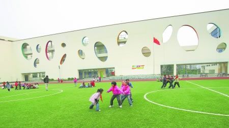 昨日下午,記者來到草堂小學翠微校區(qū),4棟通過走廊連為一體的4~5層的建筑格外引人注目。正對學校大門的墻體,鑲著10多個彩色的橢圓。設計者、西南交通大學教授王蔚介紹說,翠微校區(qū)占地20余畝,建筑面積一萬余平方米,而總投資僅2000多萬元!斑@些彩色的橢圓圖案,代表著水滴。陽光下,‘水滴’呈現出不同顏色,這代表了學生們的不同個性。校舍以‘陽光下的水滴’為設計構思,充分表達了在我國素質教育的原則下,尊重個性發(fā)展,尊重少年兒童人格特征的理念。”