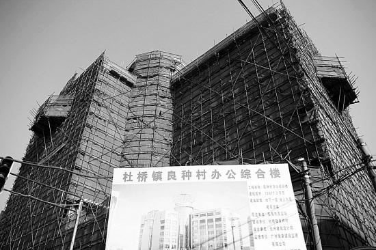 說它是熱帖,準確地說其實就是一組照片。照片中,一幢大樓拔地而起,主體框架已搭建完畢,不過由于尚未完工,整幢大樓像是穿上了一層漁網(wǎng)服。大樓底下立著一塊規(guī)劃牌,最上面寫著“杜橋鎮(zhèn)良種村辦公綜合樓”,中間是大樓的效果圖,9層高的大樓看上去頗為壯觀。
