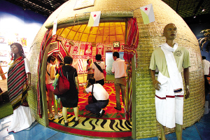 外墻頂部覆蓋著手編織帶,兩壁腰墻和地面分飾有手編掛毯和地毯,內(nèi)墻上掛有圖案抽象的繪畫和手工藝品,小小民居包羅萬象——一走進非洲聯(lián)合館內(nèi)的吉布提館,就能見一座蝸形民居“浮于水上”。這是吉布提游牧民族阿法爾人的傳統(tǒng)民居,叫“達布瓦塔”。上海世博會上的這個72平方米大小的達布瓦塔,全系在吉布提國內(nèi)造好再裝進集裝箱漂洋過海而來,所以俱是原汁原味的吉布提當?shù)仫L情。