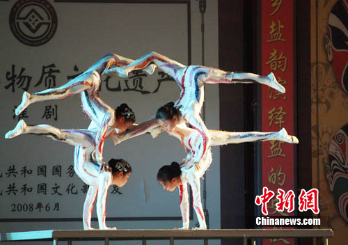 中新網(wǎng)鹽城8月19日電 (于從文 唐錚)8月18日晚,江蘇鹽城水街漂城戲苑張燈結(jié)彩,鑼鼓喧天,國家非物質(zhì)文化遺產(chǎn)淮劇、雜技在此向參加世博會“鹽城友誼日”活動的外賓獻演,美輪美奐的表演博得外賓們的陣陣掌聲。
