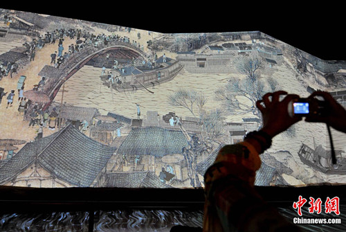 在中國館“智慧長河”展區(qū),首先映入觀眾眼簾的,是投影到100多米長卷上的北宋畫家張擇端的《清明上河圖》所描繪的北宋汴梁城的場景。穿過該投影長廊,觀眾能近距離欣賞到另一個版本的《清明上河圖》——遼寧博物館藏的明代仇英版《清明上河圖》,該圖畫中人物超2000個,所描繪的明代蘇州市井生活的繁華程度遠遠超過宋代。