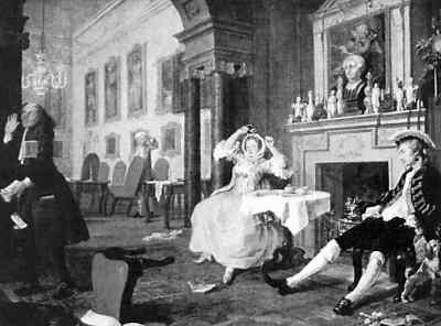 首先惹禍的是幾幅油畫作品。英國畫家威廉·霍加斯的著名作品《時髦的婚姻》在當(dāng)時被展出,這組畫共有6幅:訂婚、時髦婚姻、求醫(yī)、音樂會、決斗、自殺。正是這一組帶有強(qiáng)烈批判意義的畫引發(fā)了上流社會的不滿和爭議,紅衣大主教更是大發(fā)雷霆,下令禁士教士、學(xué)校校長和家長前去參觀,這件事在當(dāng)時也鬧得沸沸揚(yáng)揚(yáng)。