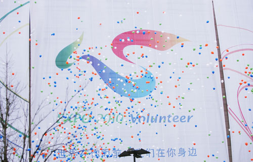 儀式上,中共中央政治局委員、中共上海市委書記、上海市世博會籌辦工作領(lǐng)導(dǎo)小組組長俞正聲揭曉了上海世博會志愿者標(biāo)志,同時懸掛在新世界商廈外墻的巨幅樓體公益廣告隨之揭曉。中國2010年上海世博會志愿者標(biāo)志的主體由漢字“心”、英文字母“V”、嘴銜橄欖枝飛翔的和平鴿構(gòu)成。與世博會會徽“世”異曲同工,在呈現(xiàn)中國文化個性的同時,表達(dá)了志愿者的用“心”和熱“心”!癡”是英文“Volunteer”的首字母,闡述了標(biāo)志所代表的群體,賦予其清晰的含義;飛翔的和平鴿代表上海,也象征和平友愛,橄欖枝則寓意可持續(xù)發(fā)展和希望,傳承“城市,讓生活更美好”的世博會主題。彩虹般的色彩,迎風(fēng)飄舞的彩帶,是上海熱情的召喚。我們相信,2010年,在志愿者的努力下,來自世界各地的人將融洽地聚集在同一片天空下!