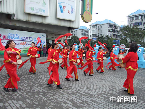 在長青路、成山路口的華聯(lián)吉買盛廣場四周,23個2米高1米寬笑容可掬的海寶圍著一圈,不斷地向前來參加活動的志愿者招手致意。一旁,喜慶的龍車上,鑼鼓敲得震天響。廣場中央,來自居民區(qū)的志愿者代表和來自社區(qū)學(xué)校的紅領(lǐng)巾代表集結(jié)在一起,他們將迎接海寶到小區(qū)。