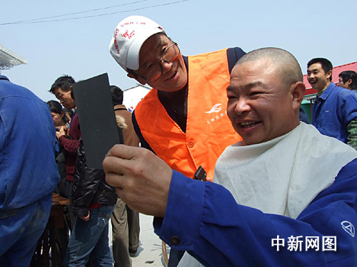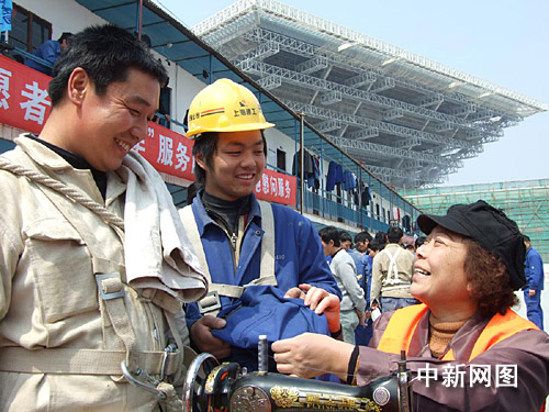 聽說服務“大篷車”要來,工地建設(shè)者早早作了準備,穿破的衣褲,穿壞的鞋都拿了出來。一位來自河南,名叫張慶國的25歲民工,由于工地工作忙,已半年沒理發(fā)了,逢午飯休息間,他對理發(fā)的志愿者師傅說:“請幫我理了光頭吧,省得頭發(fā)長難受!10分鐘后,當他拿著小鏡子,照著新理的光頭時,高興地指著腦袋說:“這下可解決了”。一旁,兩位浙江籍青年拿著剛修補好的球鞋,笑得合不攏嘴!吧虾H苏鏌崆,手藝也高。我這修好的球鞋,看不出補丁,真得太好了。”