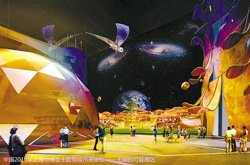 城市未來館的設(shè)計師重點推薦“未來就在這里”和“無限的可能”兩個展區(qū)!拔磥砭驮谶@里”展區(qū)是一個動態(tài)城市模型的舞臺!盁o限的可能”將在“和諧廣場”上,放映暢想未來城市的各種可能性的動畫電影。
