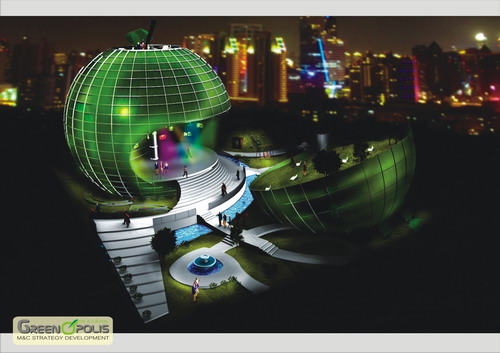 羅馬尼亞國(guó)家館的蘋(píng)果外形和標(biāo)志文字“GREENOPOLIS”體現(xiàn)了健康生活方式的重要性、對(duì)可持續(xù)發(fā)展理念的關(guān)注以及針對(duì)現(xiàn)代社會(huì)普遍存在問(wèn)題的以知識(shí)為本的解決方案。