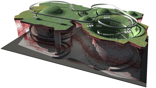 據(jù)了解,瑞士館主體結(jié)構(gòu)由兩個承重的大小圓柱和綠草如茵的屋頂組成,館內(nèi)底層展廳營造的都市空間和館頂?shù)淖匀豢臻g相互呼應(yīng),觀光纜車帶領(lǐng)參觀者往返其間,給人以身臨其境,在城市和鄉(xiāng)村之間優(yōu)游的美好感受。瑞士館另一大亮點(diǎn)是其互動閃光的帷幕外墻,將由半透明的鋁網(wǎng)結(jié)構(gòu)帷幕覆蓋,11000塊包含敏化太陽電池的的生物樹脂懸掛其上,與展館周圍的能量如陽光和相機(jī)的閃光發(fā)生反應(yīng),整個外墻呈現(xiàn)一種動態(tài)閃光的視覺效果,以此展示能源的利用。
