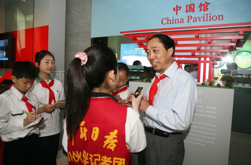 5月19日,上海世博局黨委副書記、紀(jì)委書記許偉國(guó)接受了上海市第六次少代會(huì)代表及《少年日?qǐng)?bào)》小記者的采訪。小記者們就上海世博會(huì)學(xué)生優(yōu)惠門票、小朋友如何參與上海世博會(huì)等問題進(jìn)行了提問。