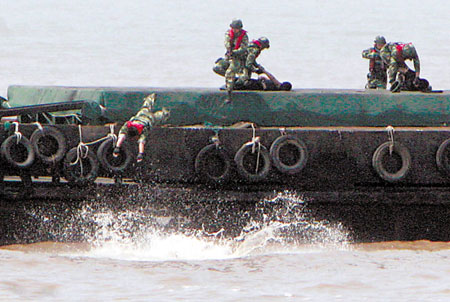 “跳幫!”一聲令下,10余名海警官兵利用兩船靠近和波浪起伏間隙最小的瞬間,飛身魚躍,紛紛越過船艇護欄,跳到貨輪上。海警擊斃一名“恐怖分子”,制伏兩人,另一名“恐怖分子”慌不擇路跳海,也被飛身入海的海警抓獲。此時藏匿在機艙的4名“恐怖分子”瞅準空隙,駕艇逃竄。
