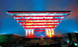 何鏡堂:我們主要從三方面著手。一是“中國印象”,主要是從繪畫、戲劇、文字、顏色等藝術形式中捕捉中國形象,中國館的整體就選用了極具中國特色的“中國紅”;二是“出土文物”,如從斗冠、寶鼎等器皿中汲取靈感,中國館分國家館和地區(qū)館兩部分,其中國家館的造型,就是通過對斗拱這一傳統(tǒng)建筑構件進行挖掘與提煉后設計出的;三是“城市園林”,從中國的城市建筑、園林中吸收營養(yǎng),例如九宮格、南北軸線等,形成經(jīng)緯分明的建筑布局。