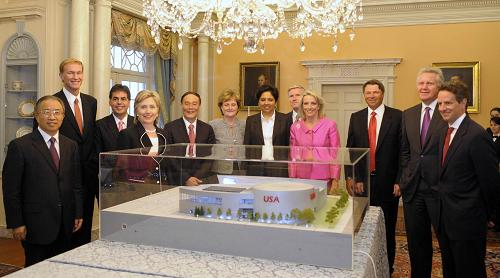 7月28日,正在華盛頓參加首輪中美戰(zhàn)略與經(jīng)濟(jì)對話的中國國家主席胡錦濤特別代表、國務(wù)院副總理王岐山和國務(wù)委員戴秉國以及美國總統(tǒng)奧巴馬特別代表、國務(wù)卿希拉里·克林頓和財政部長蒂莫西·蓋特納27日在美國國務(wù)院共同為2010年上海世界博覽會美國館模型揭幕。