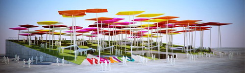 風(fēng)箏廣場(chǎng)是墨西哥館的核心。風(fēng)箏在nahuatl語(yǔ)(民族方言)的名稱(chēng)是“papalotl”,也就是西班牙語(yǔ)中的蝴蝶。風(fēng)箏是連接墨西哥文化和中國(guó)文化的一個(gè)要素。參觀者可以在墨西哥館里購(gòu)買(mǎi)風(fēng)箏,或者親手做一個(gè)風(fēng)箏,然后在風(fēng)箏廣場(chǎng)上放飛。由風(fēng)箏組成的森林代表著墨西哥人對(duì)未來(lái)的期待,廣場(chǎng)上的人造綠草表達(dá)了墨西哥人對(duì)城市綠地的關(guān)注。人們可以在綠地上進(jìn)行各種活動(dòng),諸如讀書(shū)、野餐或是在陰涼處隨意地休憩;綠地上空,風(fēng)箏在飛翔。