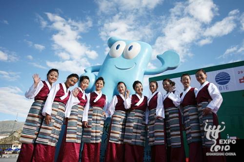在雄偉壯觀的布達(dá)拉宮前,上海世博會(huì)的使者“海寶”張開(kāi)笑臉,歡迎來(lái)自四方的游客,開(kāi)幕活動(dòng)儀式結(jié)束后,廣場(chǎng)上的民眾爭(zhēng)相與“海寶”留影紀(jì)念,他們紛紛表示希望2010年去上?词啦⿻(huì)。